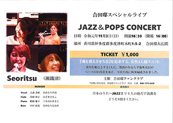 | ●11月の出演情報 合田邸スペシャルライブ JAZZ&POPS CONCERT ![]() Seoritsu(瀬織津) Vocal:大森美帆 Flute:尾崎智子 Piano:鶴岡雅子 Bass:中村尚美 日時:11月3日 開演:16:30(開場:16:00) 場所:香川県仲多度郡多度津町本町1-5-2 合田邸大広間 マップはこちら 入場料:¥1,000 ※80席限定 完全予約制 担当:久保 090-1171-8419 |